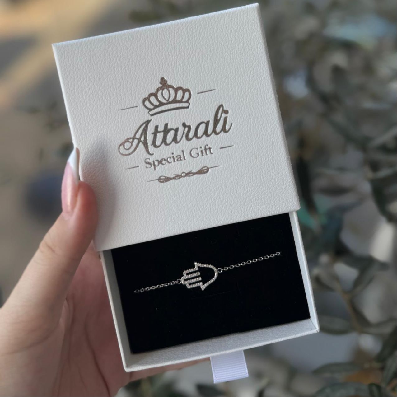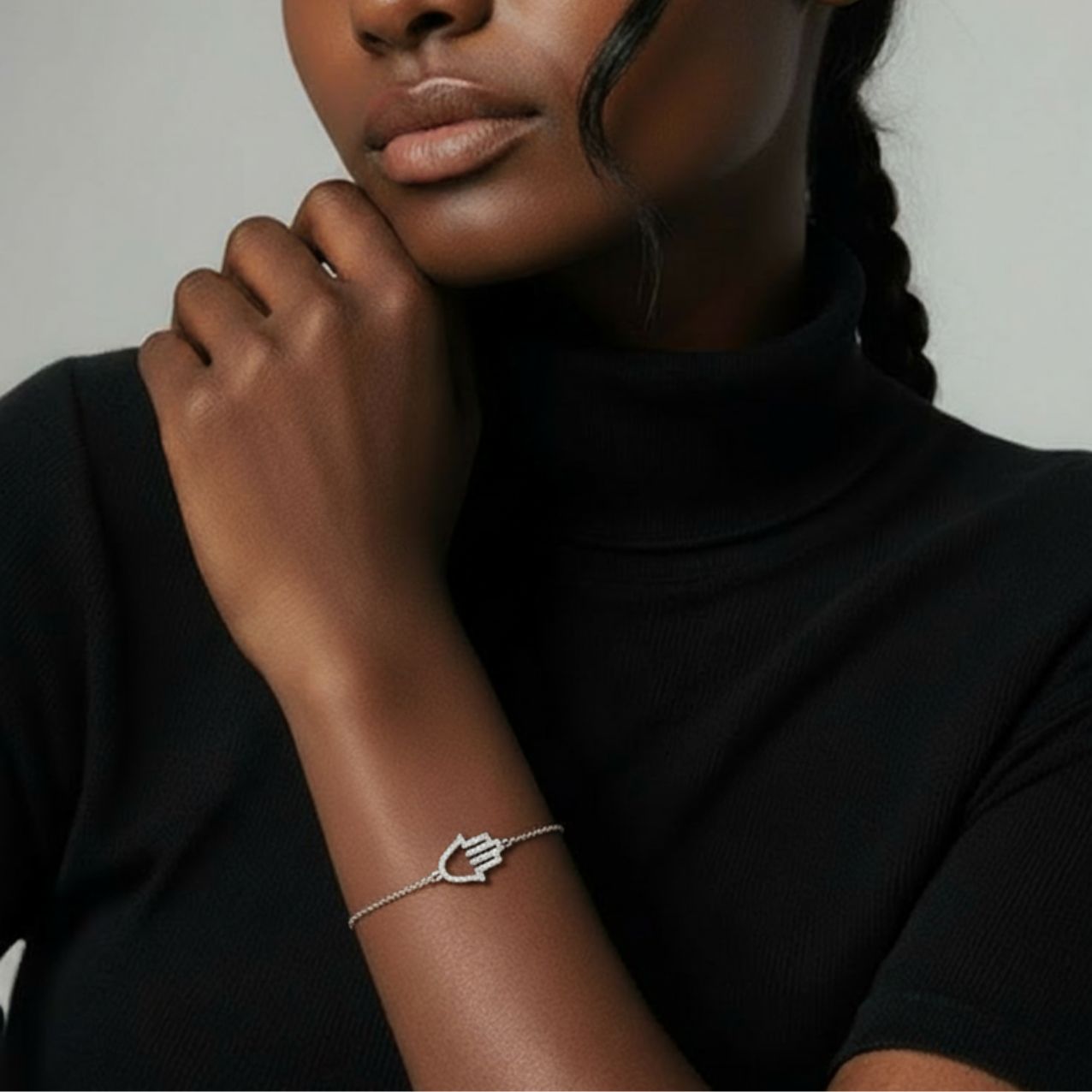 צמיד עדין ומלא נוכחות עם תליון חמסה משובץ אבני זירקון זוהרות.