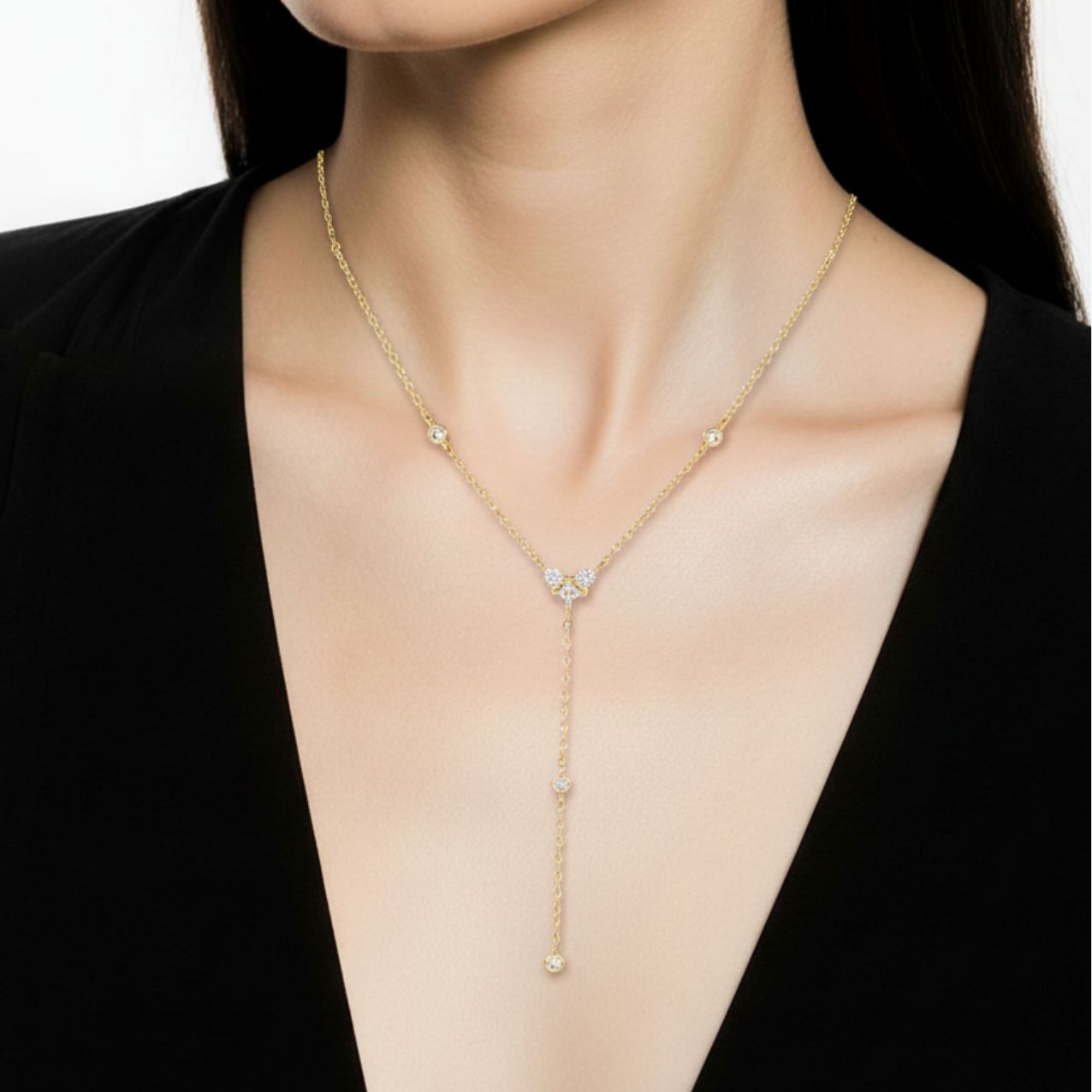 שרשרת Y בעיצוב אלגנטי ועדין, מצופה זהב 14 קראט ומשובצת בזירקונים מנצנצים.